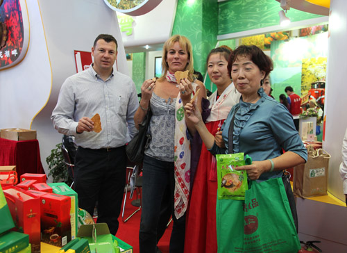 为了加快人参产业振兴,推进人参食品工作的开展,第十届中国国际农产品交易会上,吉林珲春华瑞参业生物工程公司带着自行研发的人参食品前来参展,人参月饼、人参茶、人参锅巴、人参米、人参咖啡、人参糖……应有尽有。身着朝鲜族民族服装的工作人员分外惹眼,她们一边介绍产品,一边将产品送与大家品尝。您看,两位老外也加入到分享的行列。看来,美味没有国界。